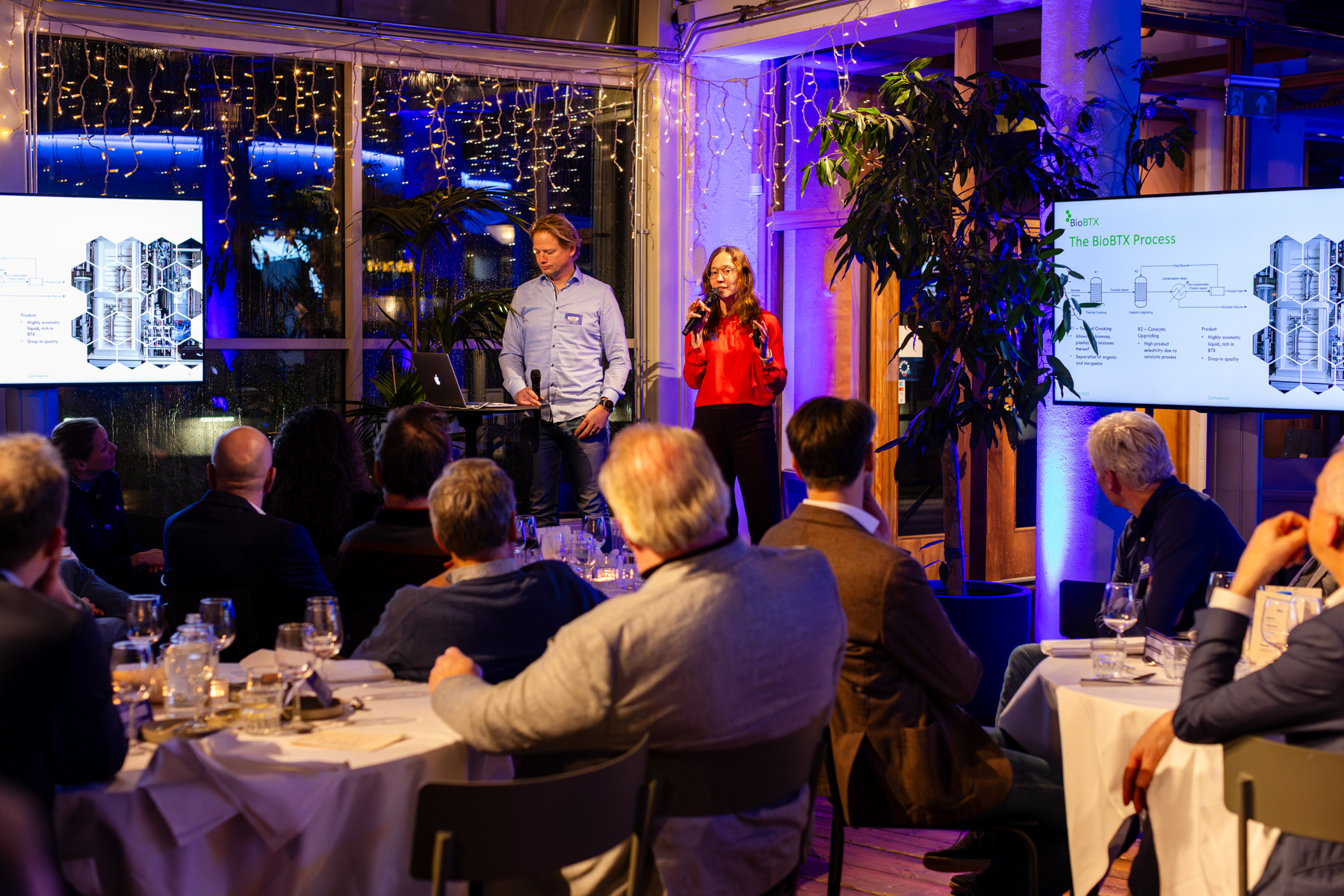 BioBTX, represented by Petra Beris (CEO Ton Vries was caught in 20 cm of snow up north) and Hans Dijkstra, is also in the critical scaling phase. Their ICCP technology (Integrated Cascading Catalytic Pyrolysis) produces aromatics such as benzene, toluene, and xylene (BTX) from waste plastics and biomass. This not only addresses plastic waste issues but also provides a sustainable source of chemical feedstocks.